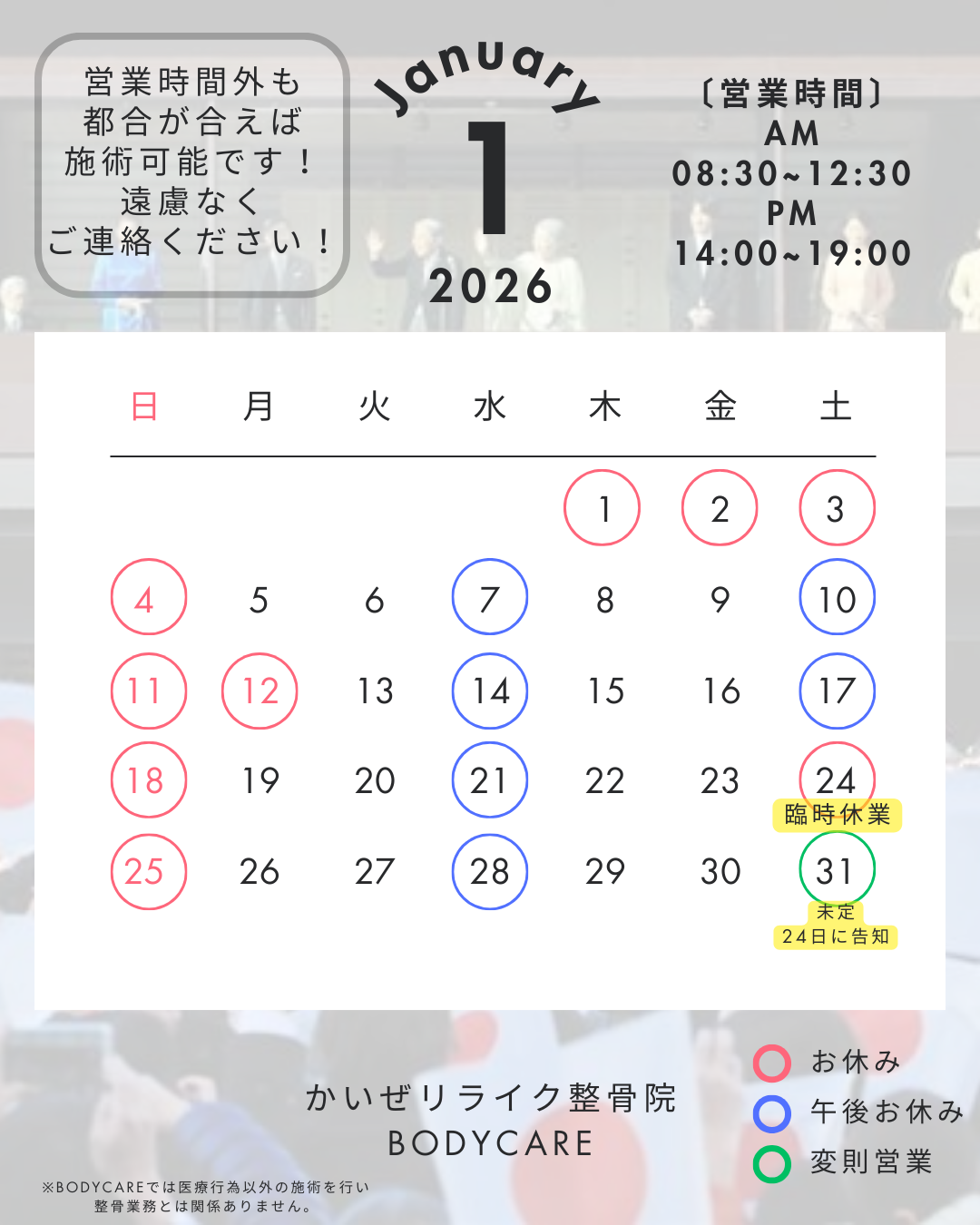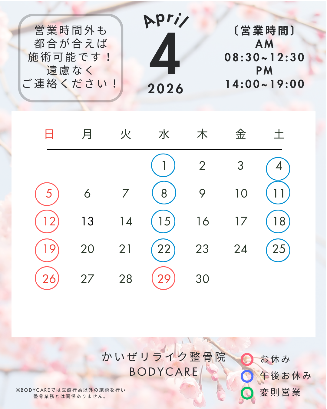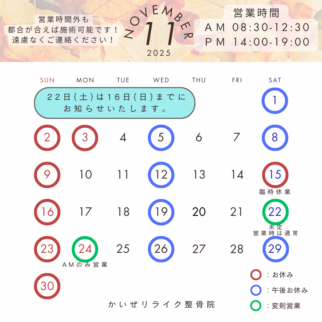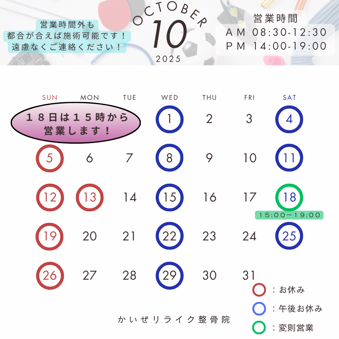 HOME 2024.06.062024.07.07 当院について 現在、準備中です。公開までしばらくお待ちください。 営業時間 月火水木金土日祝8:30~ 12:30〇〇〇〇〇〇休休14:00~ 19:00〇〇休〇〇休休休 ※水・土曜日の午後はお休みですが、都合が合えば施術可能です。遠慮なくご連絡下さい。 お知らせ お知らせ② リリースまでしばらくお待ちください。 2024.06.10 お知らせ① これは、お知らせ試験投稿です。 2024.06.10 試験投稿 かいぜリライク整骨院ホームページ制作作業中です。この投稿は、試験投稿です。リリース前に再チェックをお願いします。 2024.06.06 施術について 当院は、予約優先制です。LINEからお気軽にご予約下さい!!